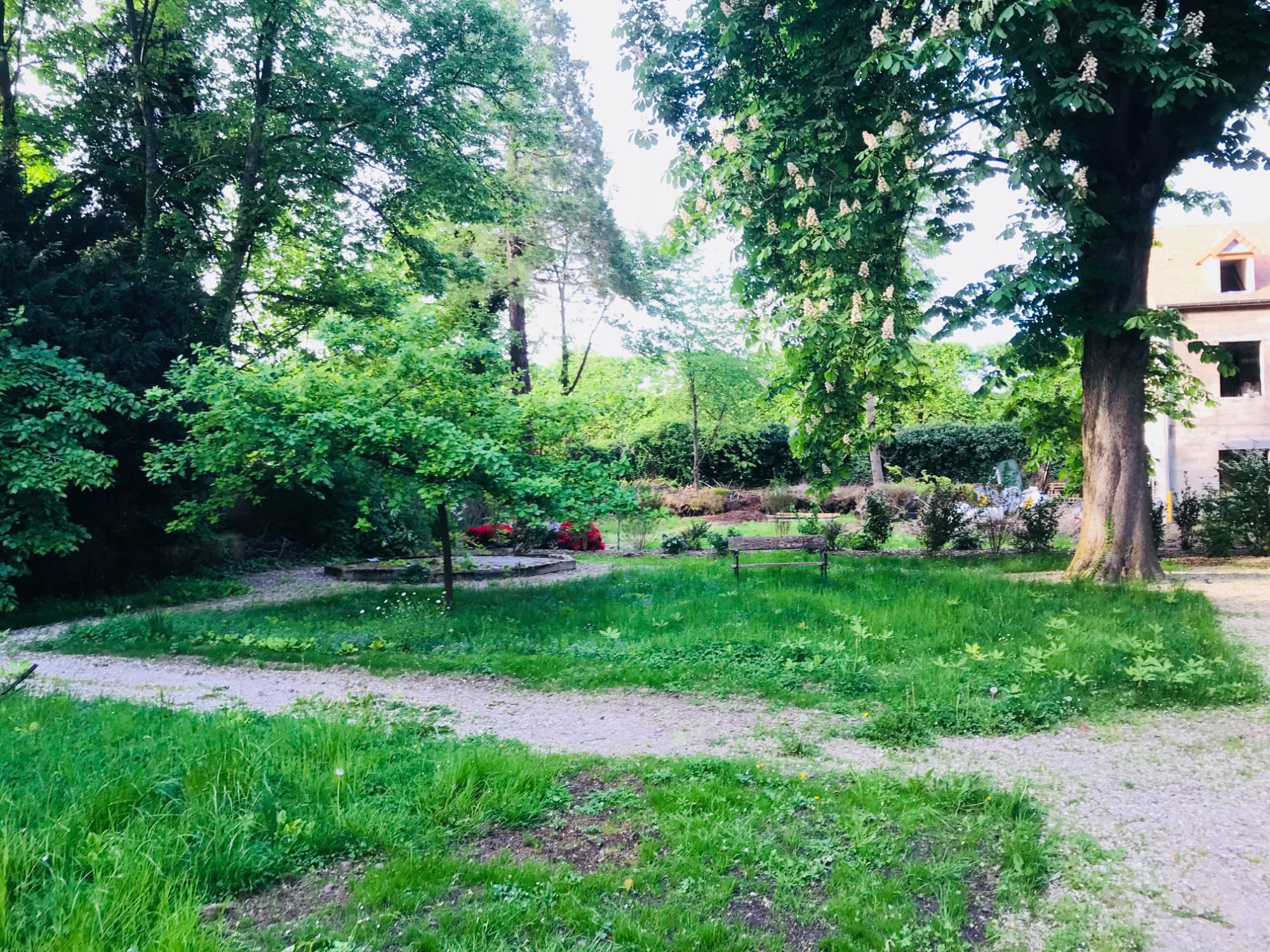 Dans une belle propriété arborée, à Versailles, nous avons réaménagé le jardin autour d'une grande pelouse agrémentée d'arbres remarquables et de massifs fleuris plantés aux abords de la maison. Pour répondre à une demande du propriétaire nous avons mis en place une clôture anti-bruit en limite du terrain.